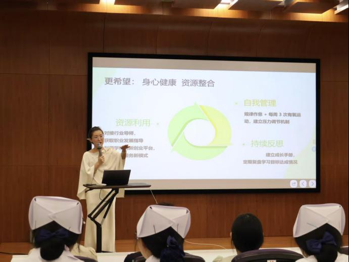 绍兴明州康复医院护理部主任周拓主任以《护理启航:校园·职场·成长》为主题,从ICU护士到护理管理者、再到跨界医药领域的多元职业路径出发,分享了护士在不同阶段的发展方向与核心能力要求,启发同学们尽早规划职业路径,拓宽职业视野。